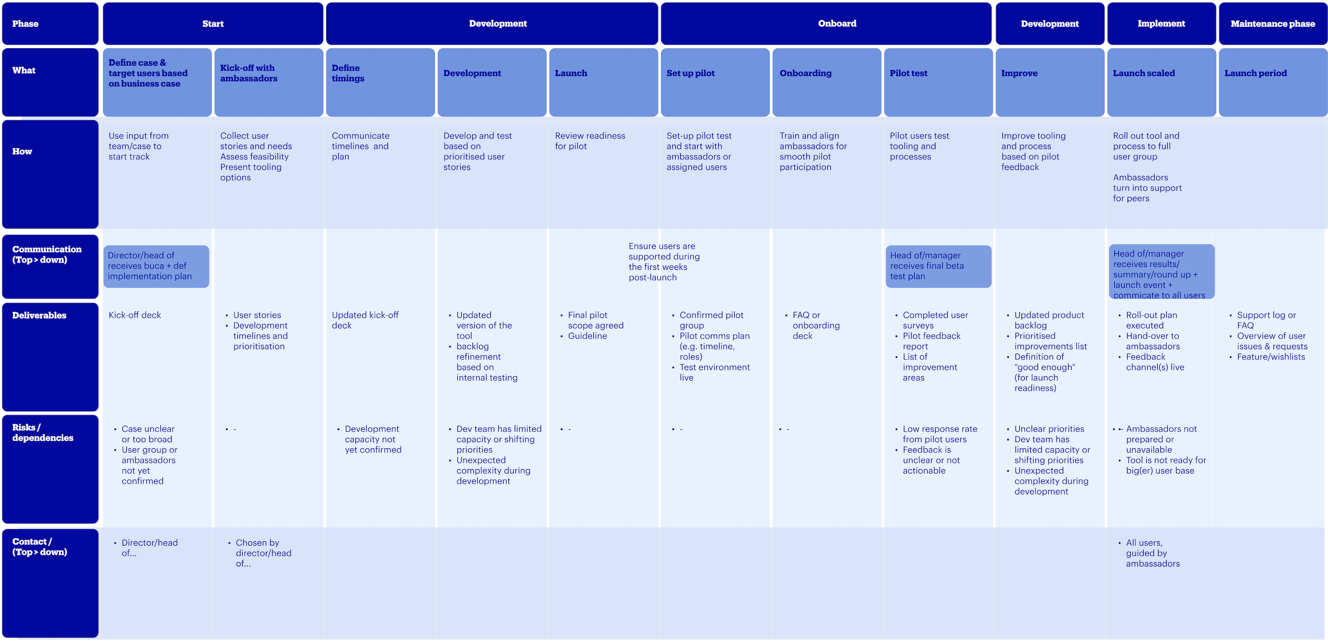 I implement processes and Self-Service AI tools, rolling them out to 5,000 people through a newly designed onboarding program. I run workshops, create guidelines, pilot test solutions, train ambassadors, update workflows, and support the launch with talks and events.