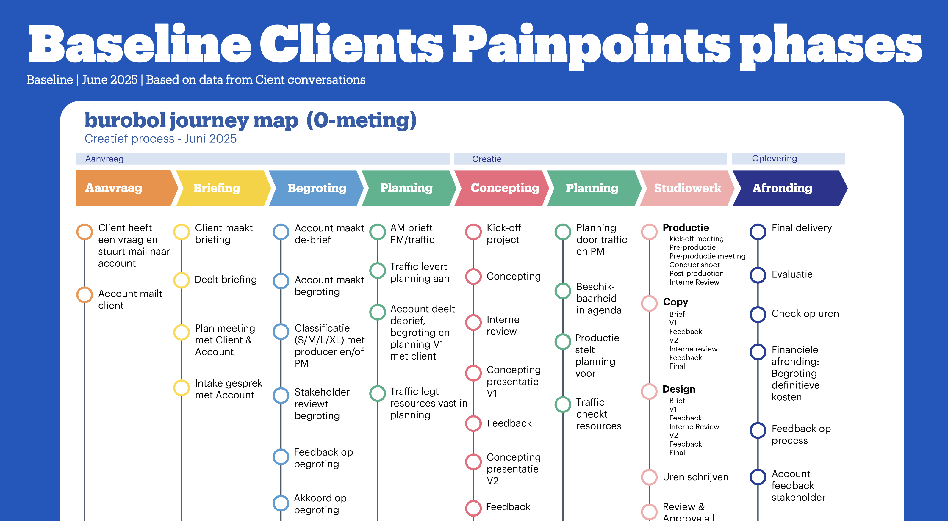 I conducted client interviews, mapped current and future workflows, identified pain points, proposed KPIs, and established a baseline to set targets and guide innovation over the next year.
