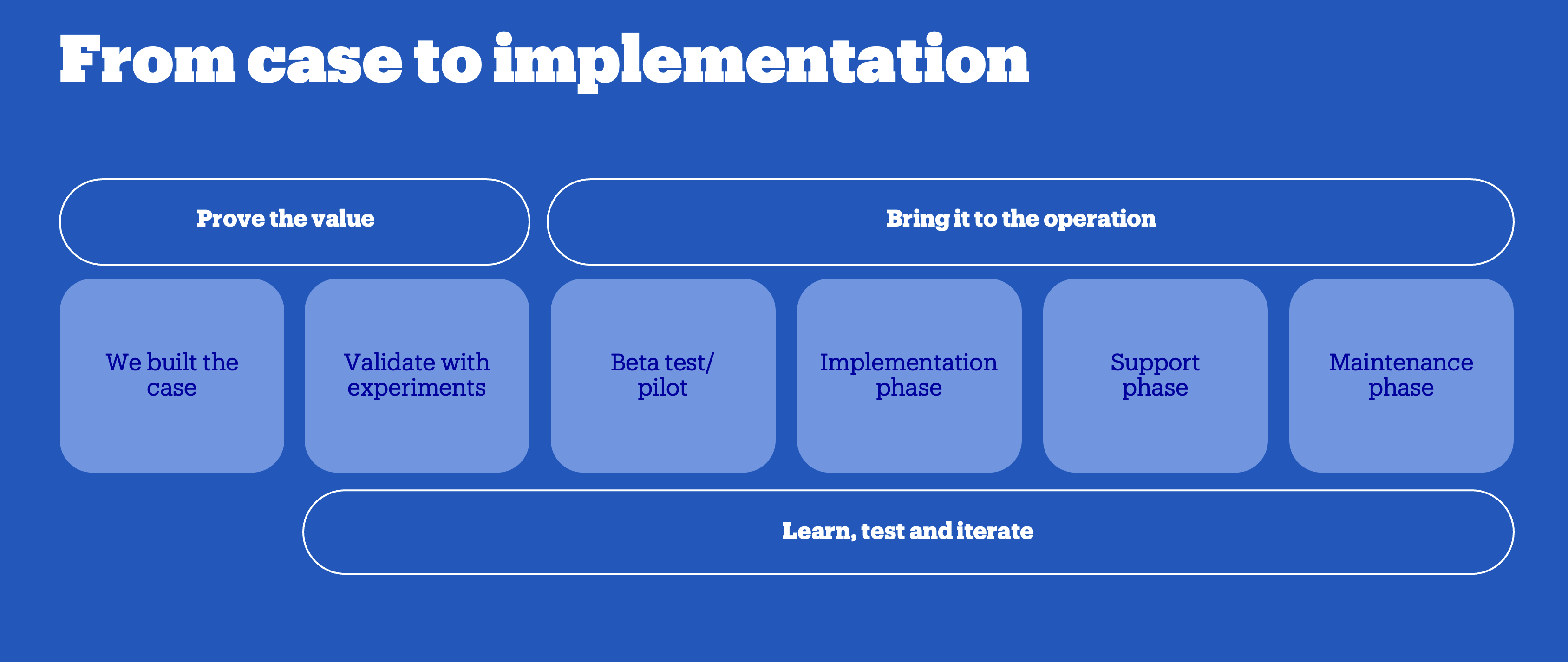 From building a case to implementation, I take ownership of the full journey. We start with a design sprint, first understanding and then defining the challenge. From there we create a proof of concept, which we test and validate through experiments and pilots. By learning, iterating, and gathering data, we build a solid case for investment. Once validated, we move into implementation, bringing solutions into the operation, adapting workflows, and proving their value. The journey continues with support, maintenance, and scaling to ensure lasting impact.
