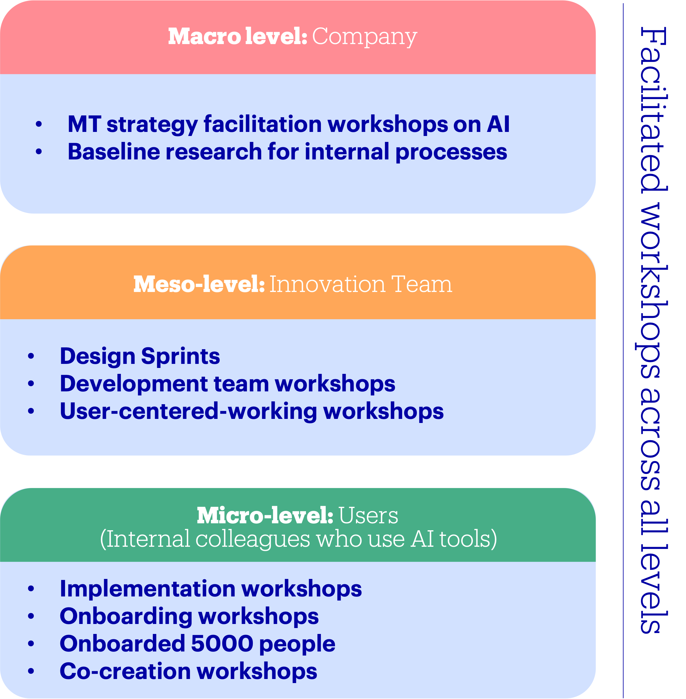 I design and facilitate workshops at all three levels, from MT to cross-functional teams to end users.