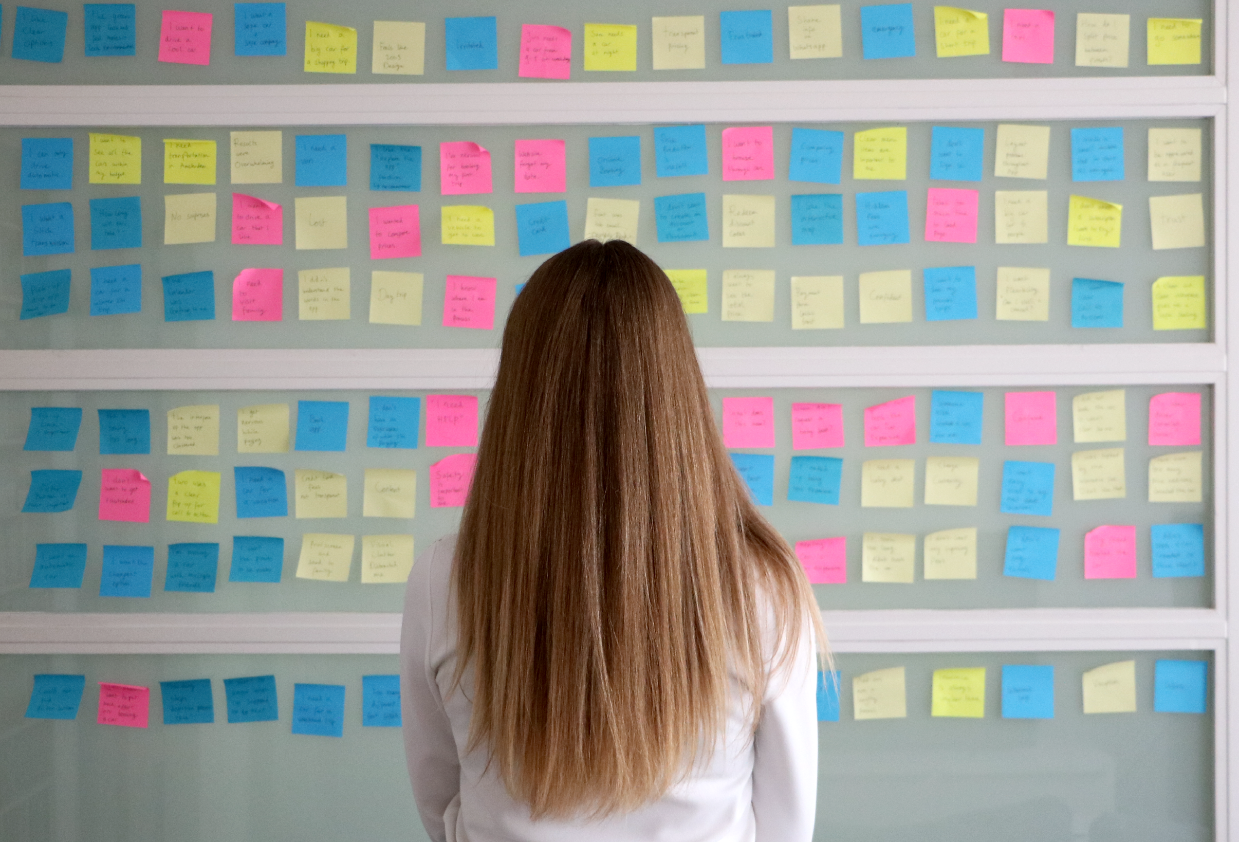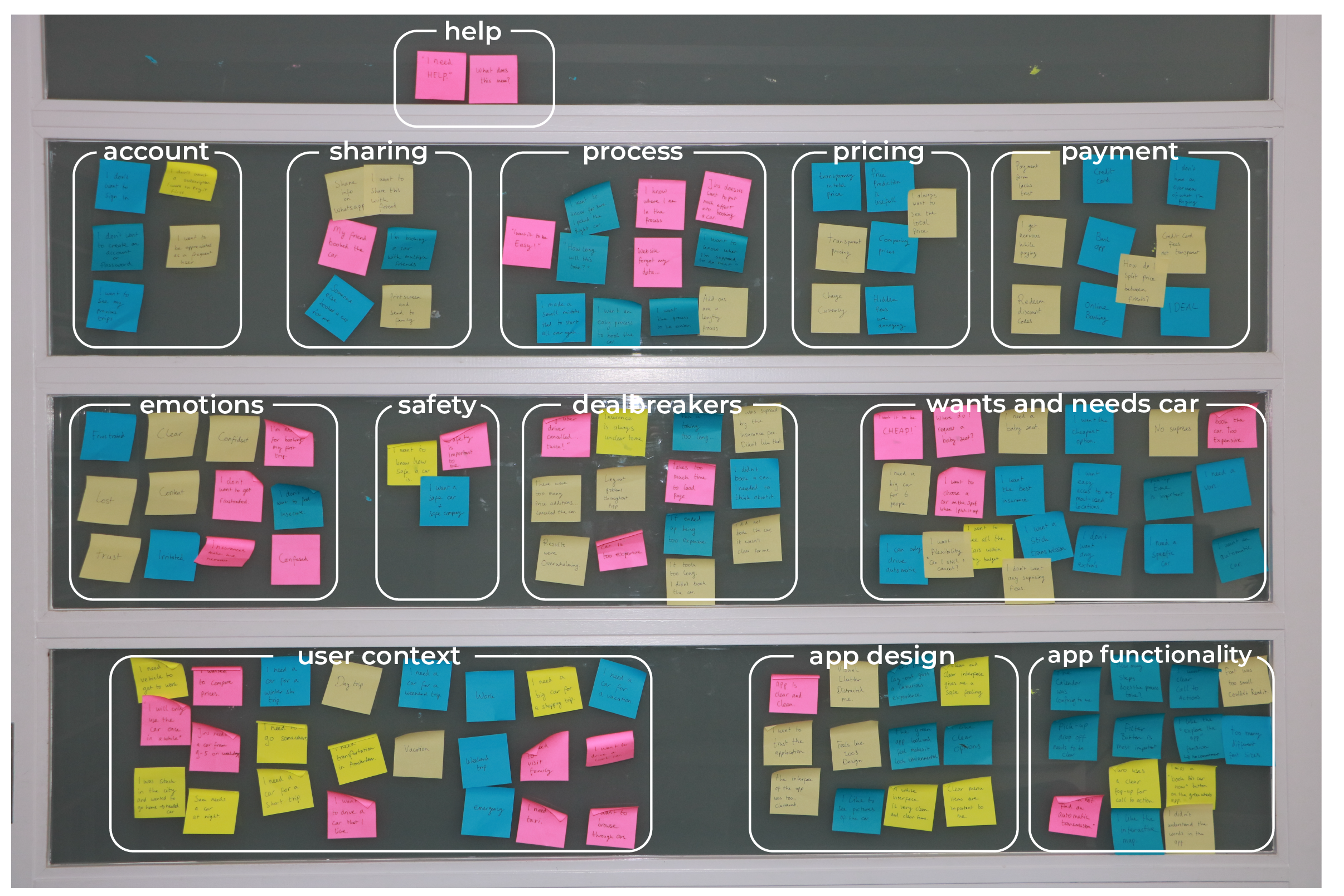 After rewatching the usability tests sessions and depth interviews, I began to take notes. I wrote each point down on post-its, without forgetting the data collected from the benchmark and online survey. After that, I stuck all the post-its on a wall and sorted them into categories to create the affinity diagram, as clear groups emerged.