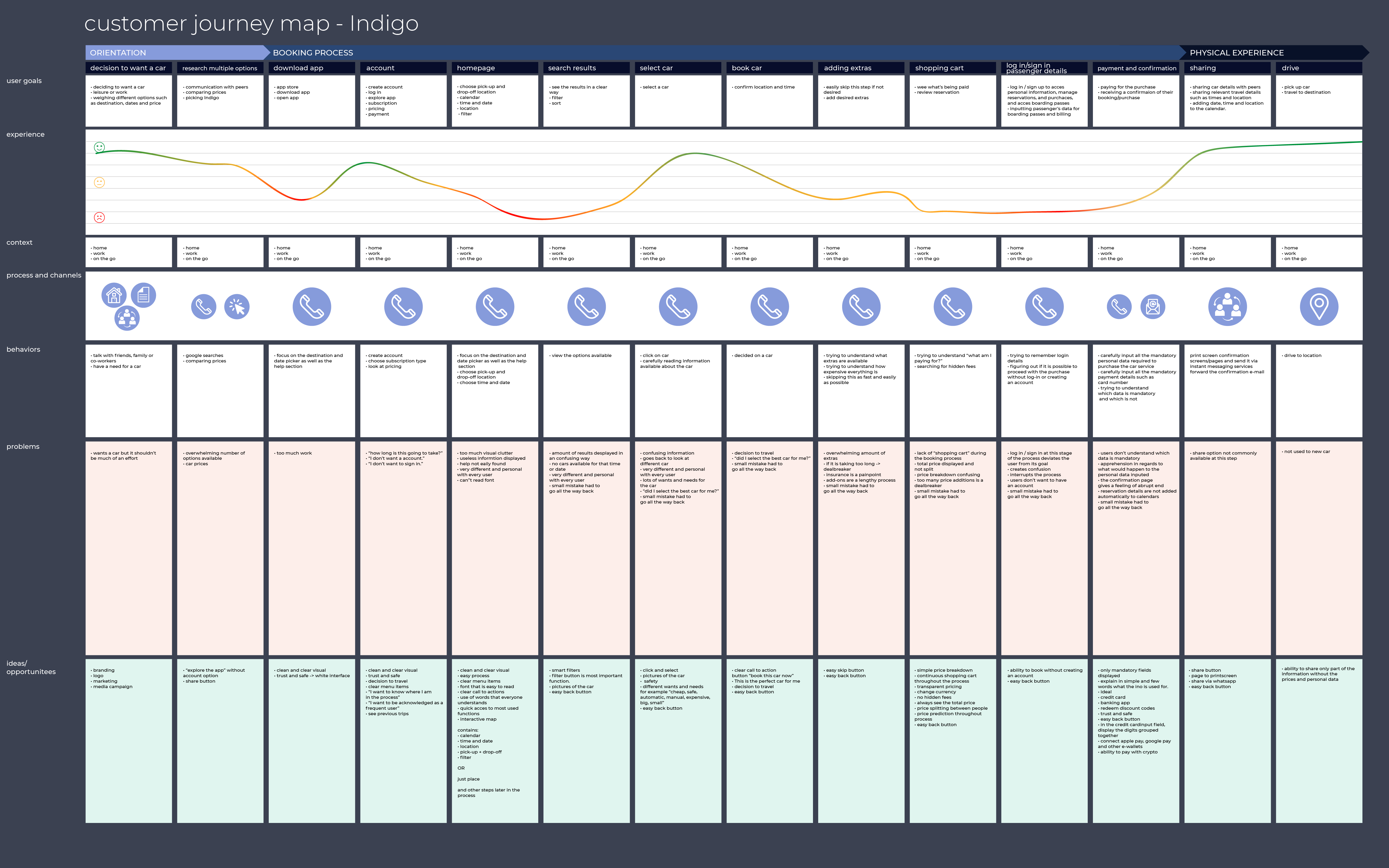 Having the information gathered from the affinity diagram, I organised it into a step by step view of the journey to show user's emotions, goals, behaviours, context and pain points at each stage of it. Alongside, I noted down ideas and opportunities to make the journey more smooth.